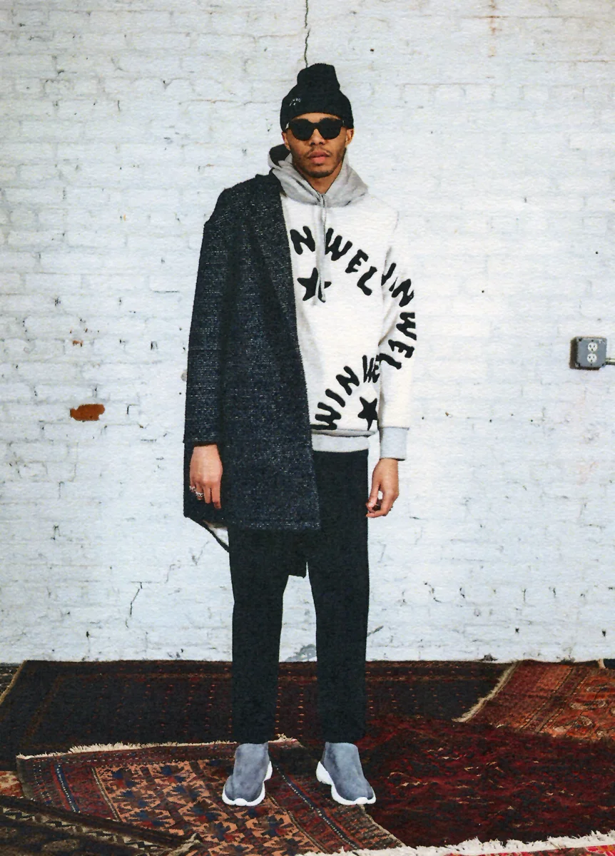 I don’t think people are falling into the whole brand name thing anymore. Nobody goes into Louis Vuitton, Gucci, or any of those stores and cops all of that stuff. Guys want the expensive, flashy shoes, but a cheaper T-shirt and beanie. That’s kind of how Winwel works, I’m making expensive outerwear, but I don’t inflate the prices of my other pieces as a result of that. I’m selling tees and beanies at standard streetwear tee price: they’re between $32–$50.